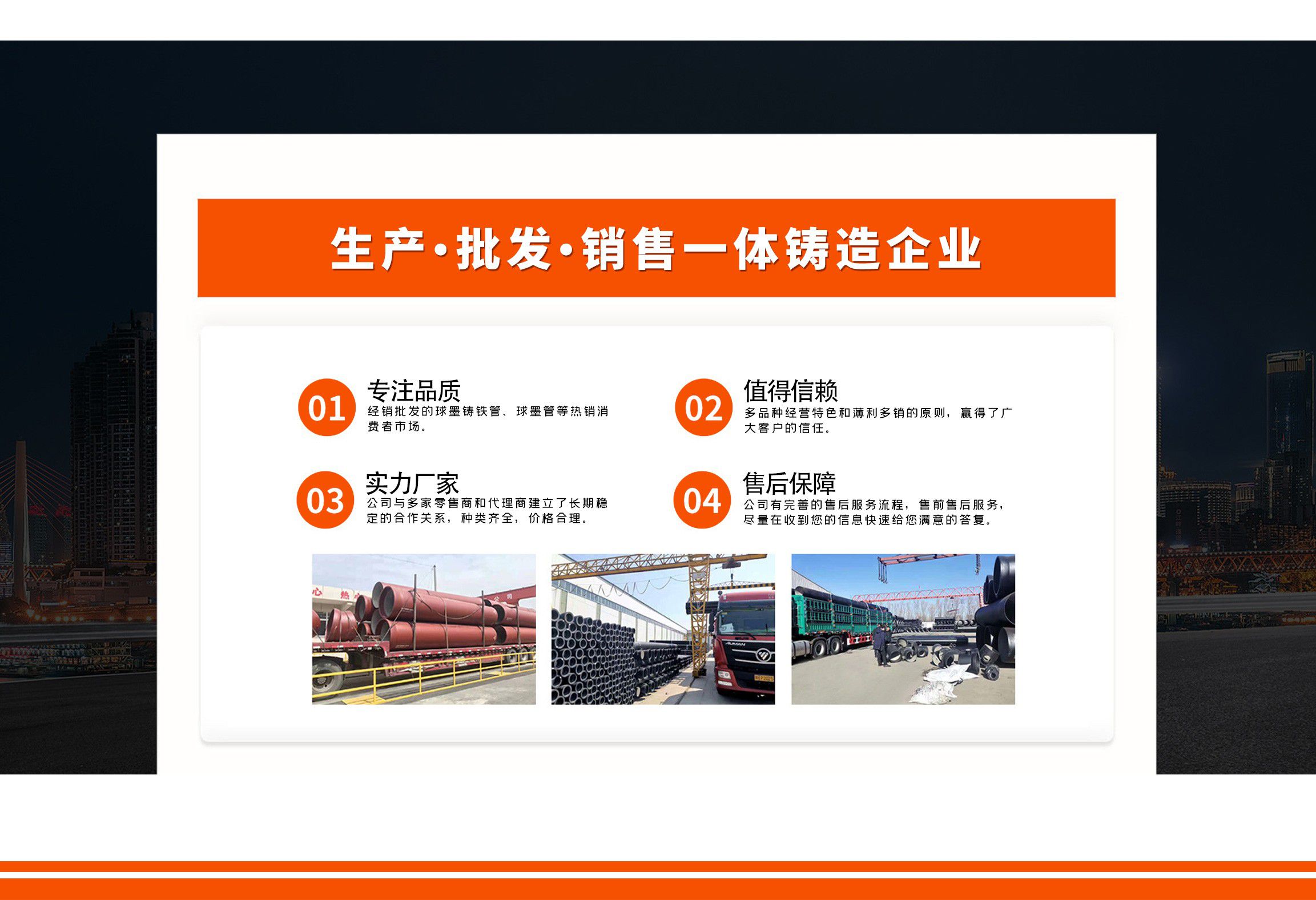 青島金源達(dá)管業(yè)有限公司主要經(jīng)營各種規(guī)格球墨鑄鐵管,球墨管,球墨鑄鐵管廠家等產(chǎn)品,質(zhì)量可靠,誠信經(jīng)營,值得信賴! 青島金源達(dá)管業(yè)有限公司始終堅持“誠信立業(yè),追求卓越,合作共贏,共同發(fā)展”,竭誠歡迎各界朋友來廠參觀指導(dǎo),洽談業(yè)務(wù)。我們愿與您攜手共進(jìn),互惠雙贏,共創(chuàng)未來! 公司堅持“以奮斗者為本”的理念,關(guān)心關(guān)愛職工,職工的獲得感、幸福感更加充實(shí)、更有保障、更可持續(xù);秉承“忠誠企業(yè)、勇于擔(dān)當(dāng)、開拓創(chuàng)新、主動作為”,堅持黨建領(lǐng)航、創(chuàng)新驅(qū)動、文化塑魂、奉獻(xiàn)社會,全面致力于綠色、低碳、高效、高質(zhì)量發(fā)展。 愿與各界朋友攜手并進(jìn),共創(chuàng)未來!...